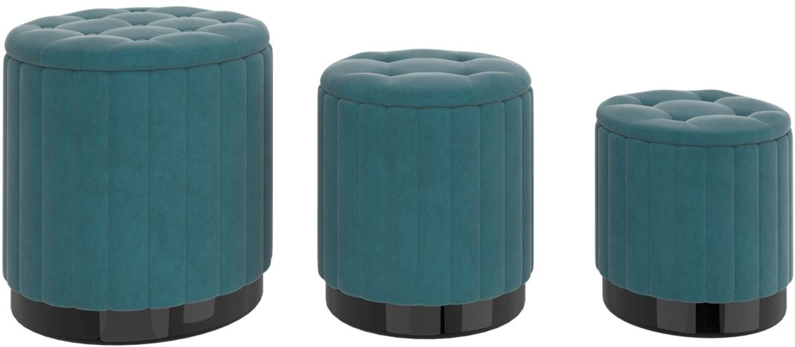 Give everyone a chance to put their feet up and relax with this 3-piece ottoman set. Each piece has it's own ample storage space, perfect for stashing throw blankets, game remotes, books, etc. Smaller pieces all nest inside the larger one so it's quick and easy to declutter when you want. Simply pull out and spread around the room as required. The beautiful vertical tufting and velvet upholstery is paired perfectly with the shiny black stainless steel base - a sparkling finish!Read More