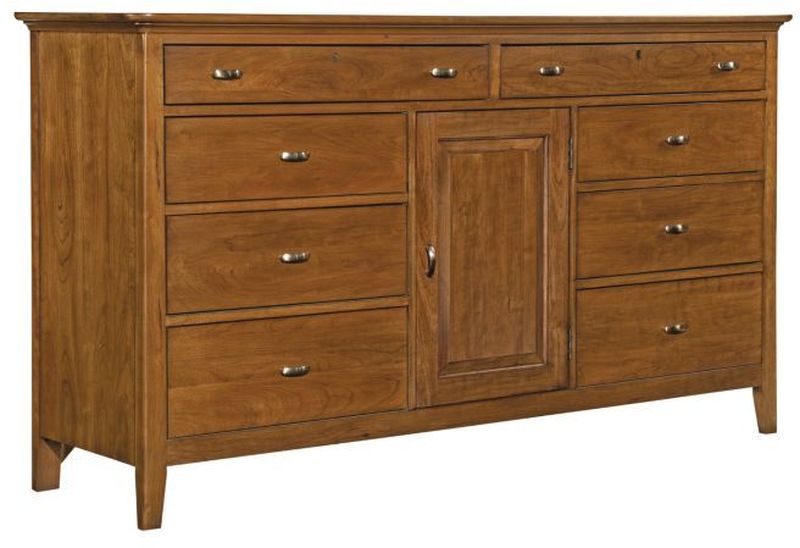 The Cherry Park Door Dresser is a large, 68 inch long dresser that offers a range of storage spaces. Made of select cherry the door dresser is built using Kincaid's signature solid wood construction. With eight conventional drawers and three smaller drawers behind the door, it provides a space for most any folded clothing item.Read More