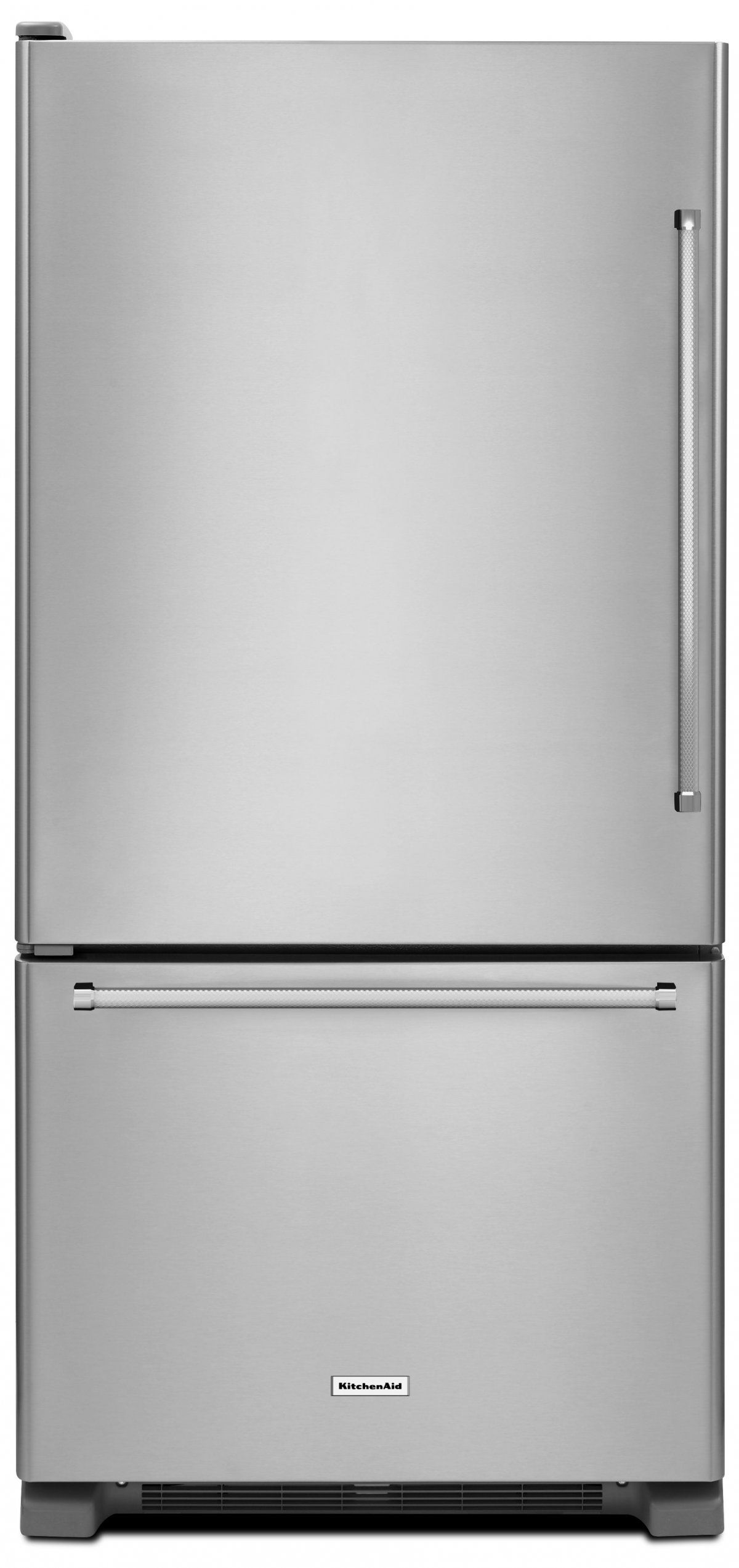 A bold blend of professionally-inspired styling and sleek touches for the home. This refrigerator features Satin Textured Handles with iconic KitchenAid Brand Medallions and a beautiful chrome frame.