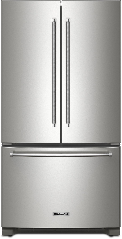 Enjoy freshness within reach. This KitchenAid® counter-depth french door refrigerator features an interior water dispenser to keep the outside looking sleek. Get customizable storage with an adjustable wood-look nesting shelf and convenient space for wide items with a full-width pantry drawer. And the counter-depth design allows the refrigerator to fit nearly flush with surrounding cabinetry, offering a built-in look and more room to move in your kitchen.Read More
