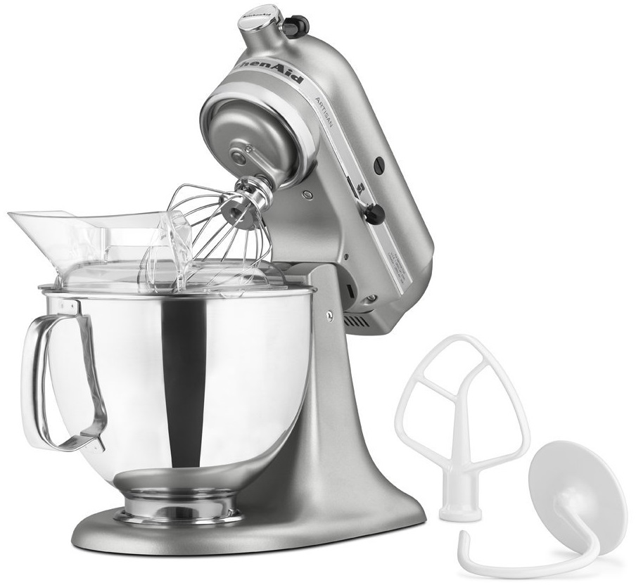 (1) Coated Flat Beater, (1) Coated Dough Hook, (1) 6-Wire Whip, (1) Pouring Shield