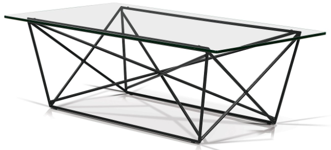 Clear tempered beveled glass with smooth polished edges floats atop black powder coated crystaline frame: For strength and durability.