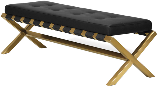 This bench is elegant and comfortable. The lightweight, brass plated brushed stainless steel frame supports a thick padded tufted faux leather cushion. This modern bench easily fits your modern decor and features a great modern design that won't go unnoticed.Read More