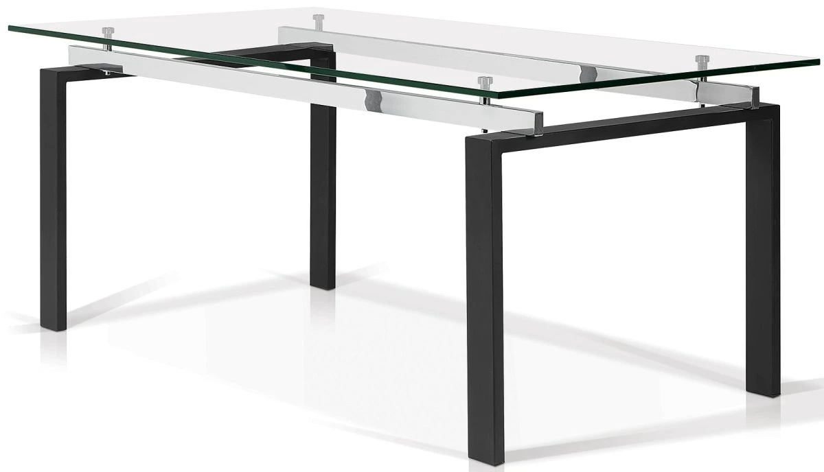 The large rectangular, clear tempered glass tabletop, gives this dining table an air of elegance.