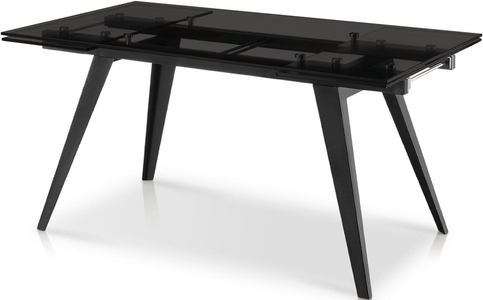This dining table celebrates strong influences in architectural themes. The angle of the legs and construction size of the metal speak to upholding the table by a powerful yet elegant polished matte black steel frame.