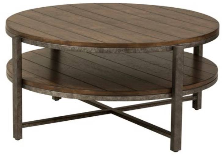 Accent your space with the rustic style Breckenridge round cocktail table. Crafted of metal tube and poplar veneers, this piece features a mahogany spice finish with pewter metal accents, appealing chattered planked top, a planked bottom shelf for additional storage, anchored by squared tube metal legs connected to a metal X stretcher. This simplistic style cocktail table would be a wonderful accent piece in any home.Read More