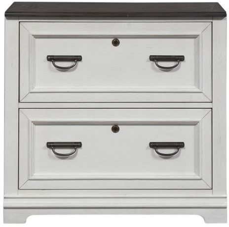 Work from home in style with the Allyson Park bunching lateral file cabinet. Crafted of pine solids with cathedral white oak tops and pine veneers, this piece features a wire brushed white finish with charcoal tops, full extension drawer glides on the two locking file drawers for easy access to storage, bottom case dustproofing to ensure longevity of contents, planked top, and is accented with antique pewter drop bail hardware. Pair with the bunching lateral file hutch to complete the set, or let this piece stand alone.Read More