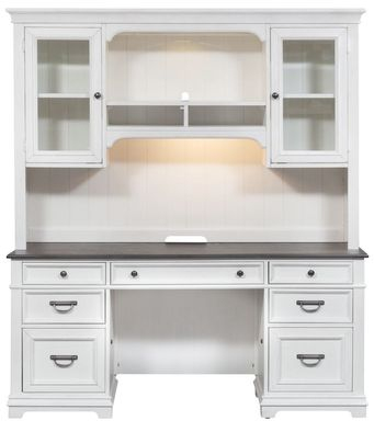 Create a classic look with a casual feel with the Allyson Park credenza and hutch. Crafted with pine solids with cathedral white oak tops and pine veneer fronts, this piece features bottom case dust proofing, a wire brushed white finish with planked charcoal tops, a flip-down keyboard tray, and an open design concept. Touch lighting illuminates the wood framed glass doors and planked back panel on the hutch. Storage abounds with fully stained full extension drawers, a locking file drawer, and adjustable shelves located in the hutch. With today's modern technology in mind, users can enjoy the convenience of the built-in wire management provisions.Read More