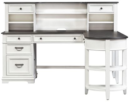 Work from home in comfort and style with the Allyson Park L-shaped desk and hutch. Crafted of pine solids with cathedral white oak tops and pine veneers, this piece features a wire brushed white finish with charcoal tops, full extension drawer glides for easy access to storage, one locking file drawer, bottom case dust proofing to ensure the longevity of contents, 2 flip down keyboard trays for user convenience, built in power supply with two outlets and two USB ports, two open shelves on right return for added storage, and is accented by antique pewter knob and drop bail hardware. The hutch features two drawers and 3 open fixed shelves. With today's modern technology in mind, users can enjoy the convenience of the built-in wire management provisions, keeping your office clean and organized.Read More