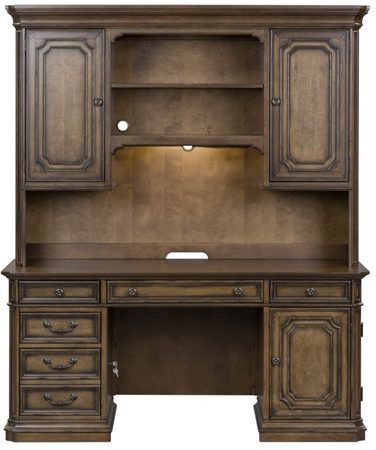 Indulge in traditional styling with the Amelia Jr executive credenza set. Crafted by poplar solids and birch veneers, this piece features an antiqued toffee finish, non-glare adjustable touch lighting, chamfered corners with a soft concave shaping, and a flip down keyboard tray. With today's modern technology in mind, users can enjoy the convenience of the built-in wire management. Storage abounds with the fully stained full extension drawers, pull-out printer/CPU drawer, adjustable shelves located in the hutch and lockable file drawer accented by brass bail pull and knob hardware.Read More