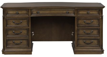 Work in style while working from home or the office with the Amelia Jr executive desk. Crafted of poplar solids and birch veneers, this piece features an antique toffee finish, seven full extension drawers for easy access to storage including two locking file drawers with bluff-cut drawer fronts to protect contents, fully stained interior drawers, framed drawer fronts with overlays, chamfered corners with soft concave shaping, a fancy face veneer top, and bead molding for enhanced detail. Amelia offers traditional styling that takes elements of the past and makes them relevant today.Read More