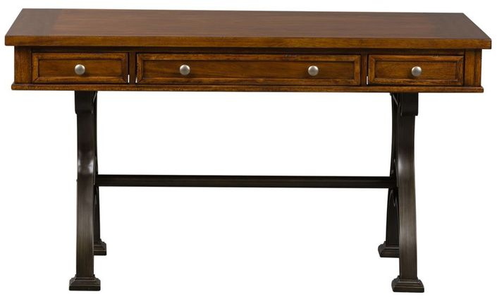 Work from home or the office in timeless style with the Arlington House writing desk. Crafted of poplar solids with acacia veneers and metal tube framing, this piece features a cobblestone brown finish and antique pewter knob hardware. The writing desk features three full extension drawers including a flip down keyboard tray, and a metal industrial style base.Read More