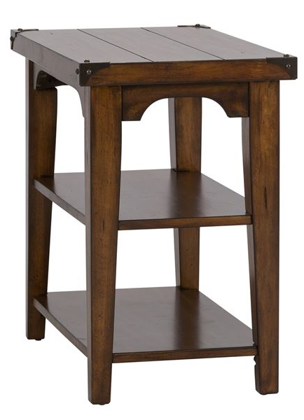 Accent your space with the traditional Aspen Skies chair side table. Crafted of pine solids and New Zealand pine veneers with metal accents, this piece features a russet brown finish, appealing planked top with metal accents and nail heads on each corner, two open design shelves for additional storage, anchored by a tapered leg design. A wonderful addition to any rustic style space.Read More