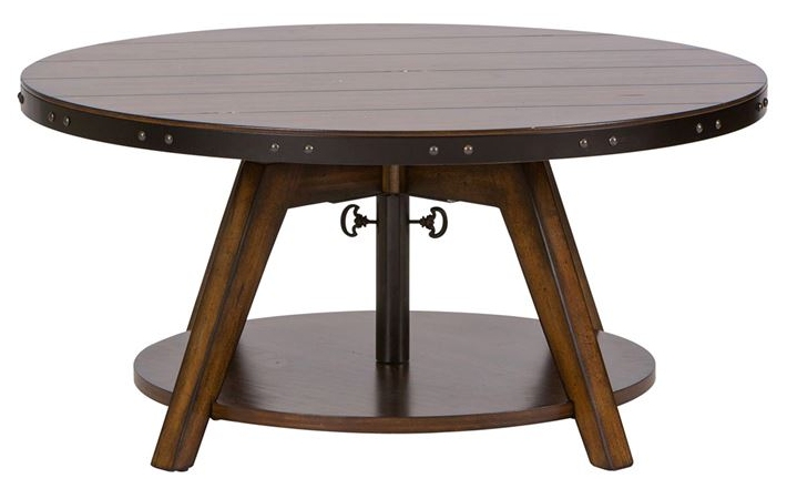 Enhance your space with the traditional Aspen Skies motion cocktail table. Crafted of pine solids and New Zealand pine veneers with metal accents, this piece features a russet brown finish, appealing planked top, bottom shelf design for additional storage, metal accents with nail heads outlining the table top, and an adjustable tabletop extending from 16" to 24". A wonderful addition to any rustic style space.Read More