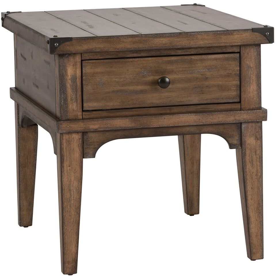 Elevate your space with the traditional Aspen Skies end table. Crafted of pine solids with New Zealand pine veneers with metal accents, this piece features a weathered brown finish with gray hang ups, planked top, one full extension drawer for additional storage, appealing pewter knob hardware, anchored by a tapered leg design.Read More