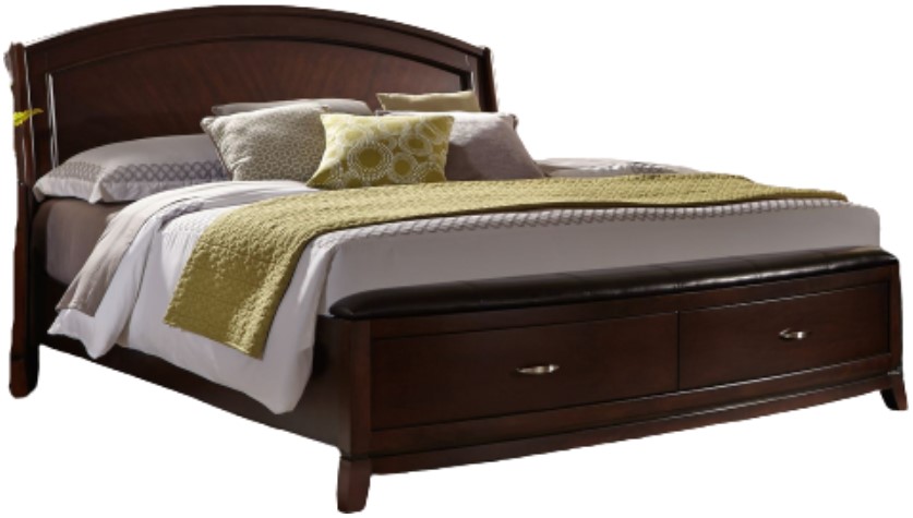 Crafted with poplar and pine solids with cherry veneers, this piece features bead molding bow front drawers, and the step top on the footboard add an edgy look. Store clothing or blankets in the full extension drawers located in the footboard equipped with dust proofing to protect your belongings and antique pewter hardware to make for easy opening.
