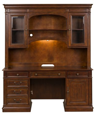 Create scale, add comfort, and define your style with the Brayton Manor Jr executive credenza set. Crafted with poplar solids with cherry and birch veneers, this piece features a smooth cognac finish, flip down keyboard tray, CPU tower/media storage space equipped with a slide out tray, non-glare adjustable touch lighting, and a locking file drawer for added security. Storage abounds with the fully stained full extension drawers and adjustable shelves behind the wood framed glass doors and center area in the hutch. With today's modern technology in mind, users can enjoy the convenience of the built-in wire management provisions.Read More