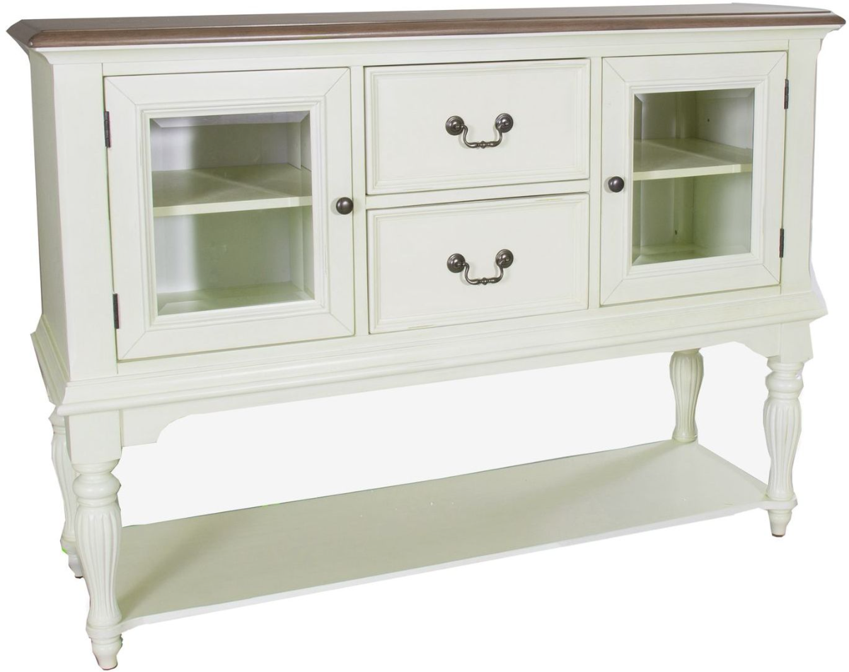 Accent your space with the Cumberland Creek server. Crafted of rubberwood and cashew solids with white oak veneers, this piece features a two-tone finish with a Buttermilk base and nutmeg top, two full extension drawers, felt lined top drawer, fully stained interior drawers, two wood framed glass doors with an adjustable shelf behind each, fluted legs, and is accented by antique pewter bail and knob hardware.Read More
