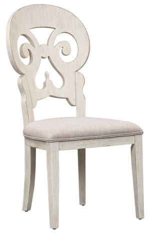 Sit in comfort and style with the Farmhouse Reimagined splat back side chair. Crafted of rubberwood solids, this piece features a timeless antique white finish with heavy wire brush distressing, khaki linen upholstered seat for added comfort, a beautifully detailed splat back, nylon chair glides to protect your flooring, and is anchored by beautifully tapered legs. This offers a look that compliments today's homes with style uncompromised and comfort abound.Read More