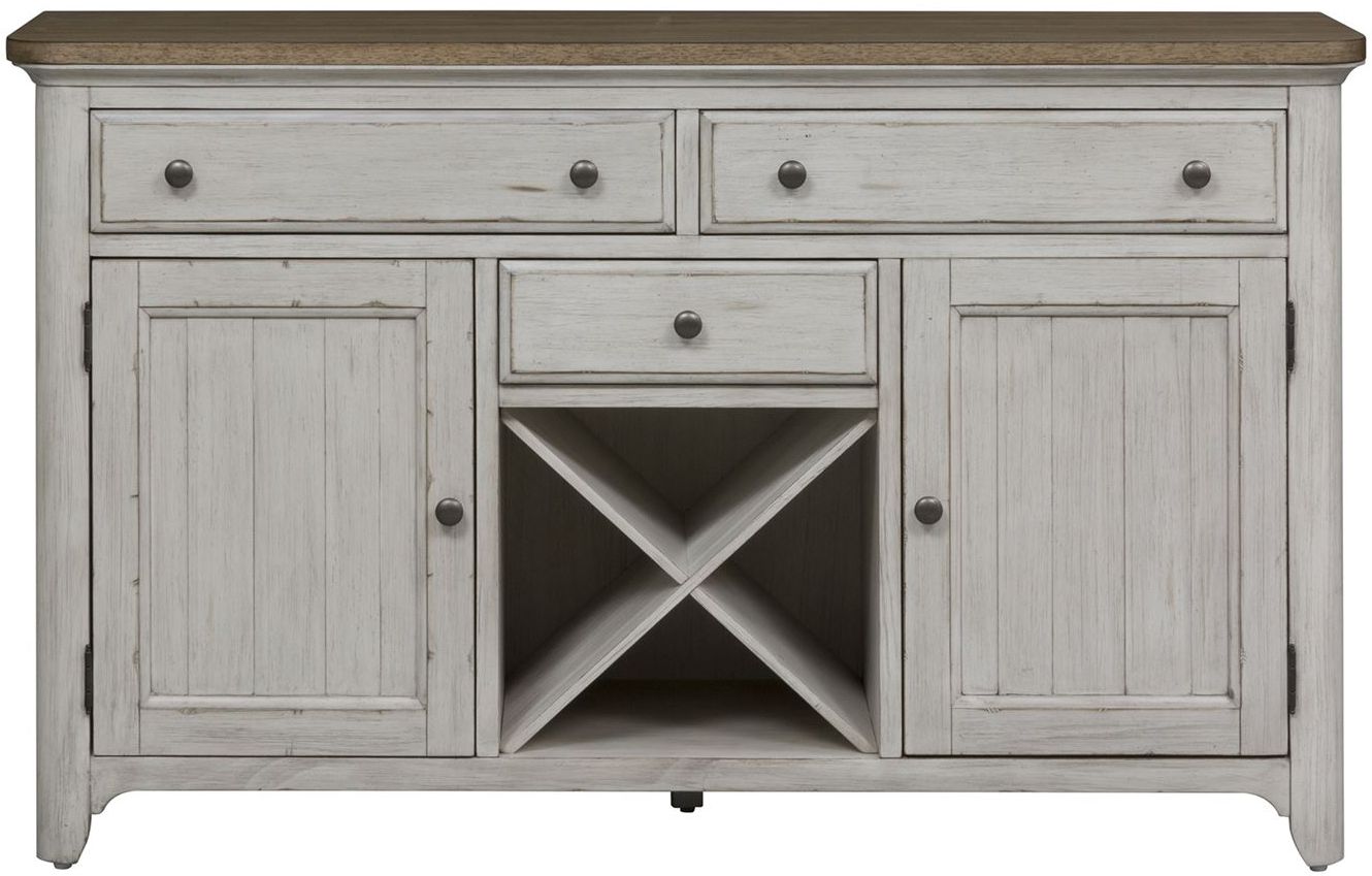 Warm and cozy. Bring beauty indoors with the Farmhouse Reimagined buffet. Crafted of pine and poplar solids with hickory and pine veneers, this piece features an antique white finish with chestnut tops. This buffet has an open X-style removable wine storage rack and a full extension drawer with a chamfered drawer front in the center of the case, flanked by two wood framed planked doors to the exterior. There is one adjustable shelf behind each door. Two felt lined full extension drawers with chamfered drawer fronts extend the top of the case, with one of the drawers featuring a silverware tray. Softly rounded pilasters add appeal to this buffet. Farmhouse Reimagined offers looks that easily work in today’s homes with style uncompromised and comfort abound.Read More