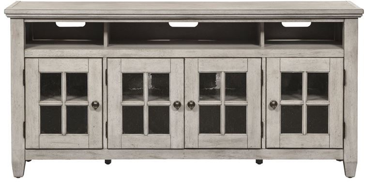 Accent your living room with the perfect vintage design, using this unique and stylish 66" tv stand. Crafted with rubberwood solids and cathedral white oak veneers, this piece can accommodate most 72" TVs and features an antique white finish, adjustable shelving, wood framed drawer fronts, raised panels, accented by timeless antiqued brass knob hardware, and has squared pilasters that seamlessly flow into heavily tapered feet. Keep it casual with the simple wood framed doors or step it up with the interchangeable decorative tile look. With today's modern technology in mind, users can enjoy the convenience of the open compartment areas and wire management provisions to hide those pesky wires from your DVD player or gaming console of choice.Read More