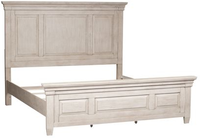 Fall into this farmhouse style Heartland panel bed. Crafted with rubberwood solids and oak and birch veneers, the antique white finish features artistic distressing, which gives this piece unique characteristics in line with an antique appeal. Heavy top crown molding and raised panels on the headboard and footboard complete this farmhouse look. Never question the reliability of the bed due to the bolt-on rails and center supported slat system.Read More