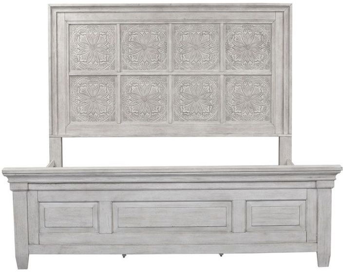 Fall into this farmhouse style Heartland panel bed. Crafted with rubberwood solids and oak and birch veneers, the antique white finish features artistic distressing, which gives this piece unique characteristics in line with an antique appeal. Beautiful antique ceiling tile panels on the headboard and heavy top crown molding around raised panels on the footboard complete this farmhouse look. Never question the reliability of the bed due to the bolt-on rails and center supported slat system.Read More