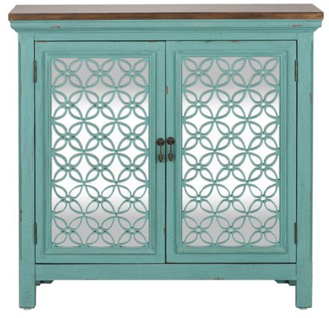 Transform your home with the Kensington 38" accent cabinet. Crafted of Eucalyptus solids and Ash veneers in a wire brushed Turquoise finish and Spice wood tone top. Features two mirrored doors with decorative floral pattern overlays, block feet and one concealed fixed shelf behind doors. A unique piece that will work with any décor from traditional to contemporary.Read More