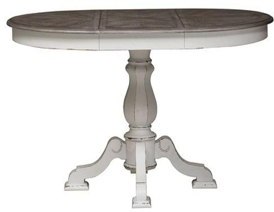 Gather the family together for dinner around the Magnolia Manor pedestal table. A 42" round is perfect for small spaces or add in the 18" leaf to expand the table to an oval for larger crowds. Crafted of poplar solids and white oak veneers the pedestal table features a fancy face top finished in a weathered brown. The faceted turned base is finished in an antique white with heavy chipping that is accented by splayed feet. Perfect for any decor from farmhouse to cottage living.Read More