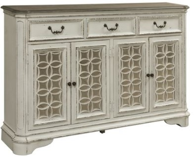Make entertaining easy and stylish with the Magnolia Manor Hall Buffet. Use this piece in the entryway as a statement piece or as a hosting buffet in your dining room. Featuring a blending of European influences the hall buffet is crafted of poplar solids and white oak veneers finished in a weathered brown and antique white finish with heavy chipping. Four doors create a unique design opportunity with an overlay grid pattern that will work with the mirrored panel or wood tone panel for two completely different looks. Behind the doors are 4 adjustable shelves for storage. The case is rounded out with three drawers that feature full extension drawer guides and a fully finished interior.Read More