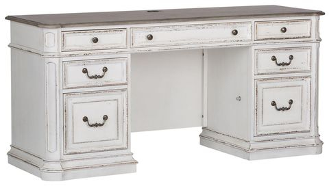 Blend European influences to create the Magnolia Manor credenza. Crafted with poplar and rubberwood solids with white oak and birch veneers, this piece features framed drawer fronts accented by antique pewter hardware, two large file drawers that can be locked, canted corners, and a flip-down keyboard tray. With today's modern technology in mind, users can enjoy the convenience of the built-in wire management provisions, two outlet ports, and two USB ports. Bead molding accents the fully stained full extension drawers, topped off by the weathered brown finish credenza top. Warm antique finishes and artistic distressing along with grand scale a group to be passed to generations.Read More