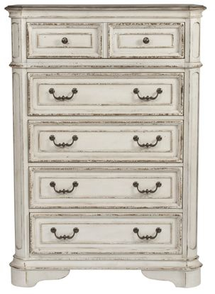 This 5-drawer chest is the perfect way to accent your room with an effortless blend of European Traditional design. Weathered brown whitewash top paired with the antique white finish creates a truly unique look. Softness is added to the design with canted corners and rounded pilasters, accompanied by bead molding on each drawer front. The chest features fully stained interior drawers, felt lined top drawers, and cedar lined bottom drawers that are accented by custom antique pewter bail and knob hardware.Read More