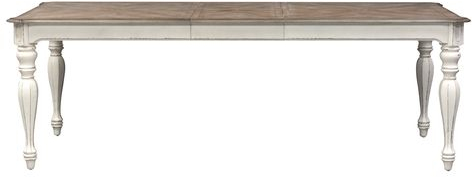 Gather in style with the Magnolia Manor rectangular leg table. Crafted of poplar solids with white oak and birch veneers, this piece features the perfect blend of European design with a weathered brown top accented by whitewash, one 18-inch removable leaf, a fancy face veneer dining top, canted corners, and is anchored by faceted turned legs. Warm antique finishes and artistic distressing along with grand scale a group to be passed to generations.Read More