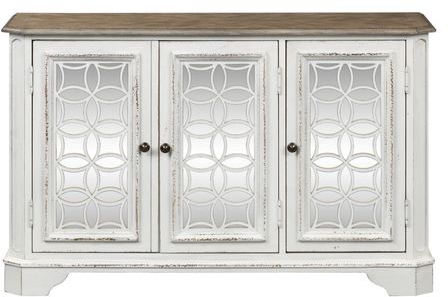 Accent your space with the perfect blend of European design with the Magnolia Manor tv console. Crafted of poplar solids with white oak and birch veneers, this piece features a fancy face top finished in a weathered brown with whitewash, canted corners on the front, bead molding, two adjustable shelves hidden behind three decorative wood framed mirrored doors, and is anchored by bracket feet. With today's modern technology in mind, users can enjoy the convenience of the built-in wire management provisions, perfect for accommodating DVD players or a gaming console. Warm antique finishes and artistic distressing along with grand scale create a piece to be passed to generations.Read More