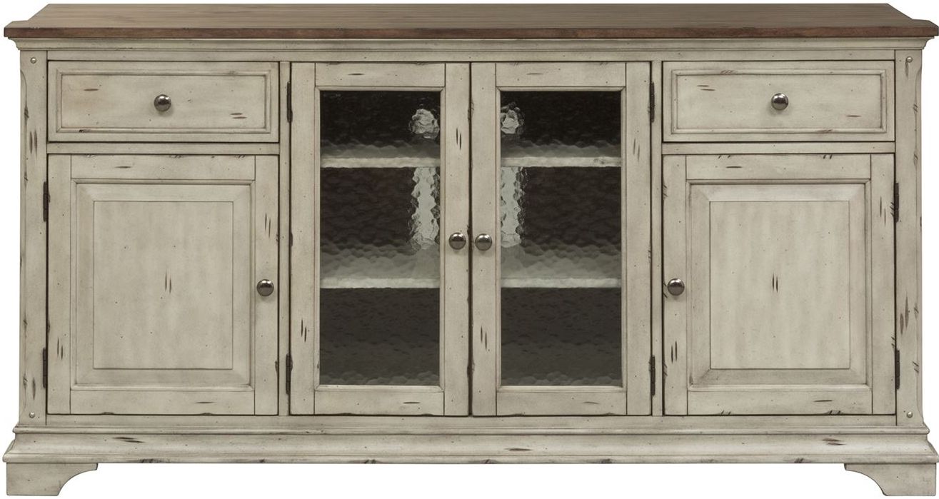 Combine traditional living and todays modern lifestyle effortlessly with the Morgan Creek 68" tv stand. Crafted with polar solids with pine and birch veneers, this piece can accommodate most 76" TVs and features an antiqued white base with brushed tobacco tops and heavy distressing, wood framed glass doors that allow for remotes to work through the glass, removeable side molding that allow this piece to stand alone, adjustable shelving, and is anchored by bracket feet. Wire management provisions effortlessly accommodates a DVD player or gaming console of choice. The warm antique finishes and artistic distressing along with grand scale, makes this a piece to be passed on to generations.Read More