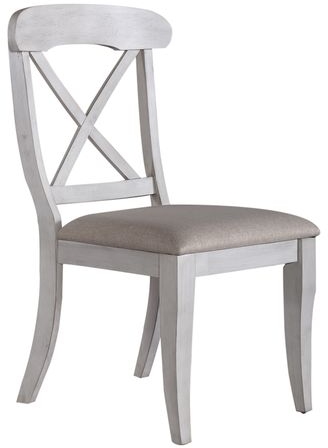 Sit in comfort and style with the Ocean Isle upholstered x back side chair. Crafted of rubberwood solids, this piece features an antique white finish, nylon chair glides to protect flooring, upholstery in a grey linen, timeless napoleon styling, and is anchored by saber legs.Read More