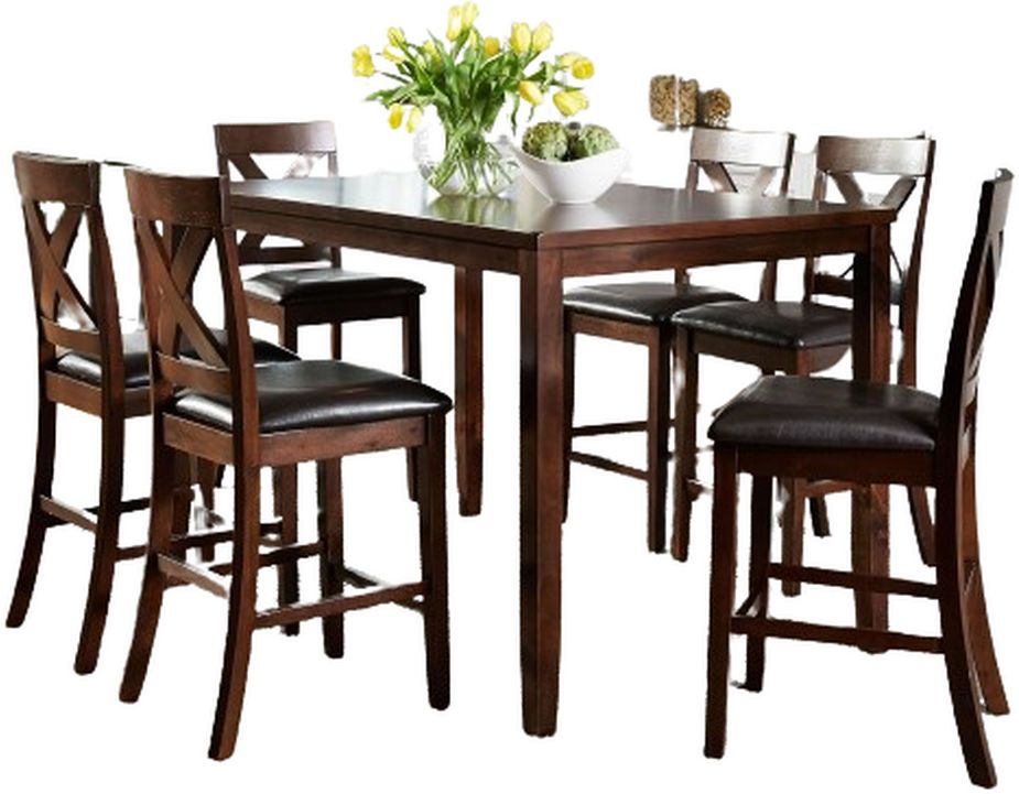 Sitting pretty with the Thornton seven-piece gathering table set. Crafted of rubberwood solids and MDF with mango veneers, this set features a russet finish and includes six x-back counter height chairs and a gathering table.Read More