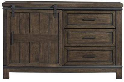 Add a natural feeling to your living space using the Thornwood Hills barn door dresser. Crafted by rubberwood solids and mango veneers, this piece features a rock beaten gray finish with saw cuts, planked tops and sides, sliding planked door with two adjustable shelves behind the doors, three drawers with framed drawer fronts, fully stained interior drawers, wide pilasters with block feet, felt lined top drawer, full extension metal drawer glides for easy access to storage, and heavy distressing.Read More