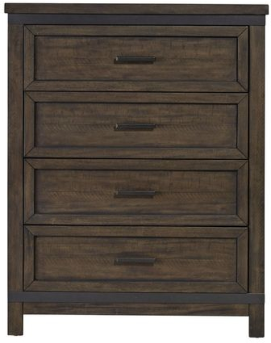 Add a natural feeling to your living space using the Thornwood Hills 4 drawer chest. Crafted by rubberwood solids and mango veneers, this piece features a rock beaten gray finish with saw cuts, wide pilasters with block feet, planked top and sides, fully stained interior drawers, felt lined top drawer, full extension drawer glides for easy access to storage, hammered metal bar pull hardware in a dark antique pewter, framed drawer fronts, bottom case dust proofing to protect contents, hand hammered metal strip accents, and heavy distressing.Read More