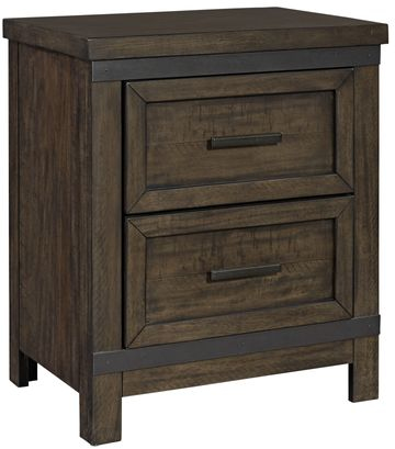 Indulge in a casual, yet contemporary look with this Thornwood Hills nightstand. Crafted with rubber wood solids and interesting mango veneers, this piece features fully stained interior drawers, planked tops and sides, full extension metal drawers for easy access to storage, a felt lined top drawer, and bottom case dust proofing. This nightstand is sure to stand out in any room with its hammered metal strip accents, dark antiqued pewter bar hardware and the unique rock beaten gray finish with detailed saw cuts.Read More