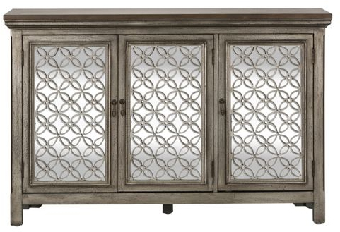 Transform your home with the Westridge 56" accent cabinet. Crafted of Eucalyptus solids and Ash veneers in a wire brushed gray and white dusty wax finish. Features three mirrored doors with decorative floral pattern overlays, block feet and one concealed fixed shelf behind doors. A unique piece that will work with any décor from traditional to contemporary.Read More