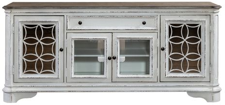 This European traditional styled 74" tv stand is sure to be the focal point of any living room and can accommodate most 80" TVs. Crafted with poplar solids and white oak and birch veneers, this piece features an antique white finish, wood framed glass doors that allow controllers to work through the glass, adjustable shelf space, and antiqued mirror doors with grid overlay, and is accented with antique brass knob hardware. With today's modern technology in mind, users can enjoy the convenience of the wire management provisions to hide those pesky wires from your DVD player or gaming console of choice.Read More