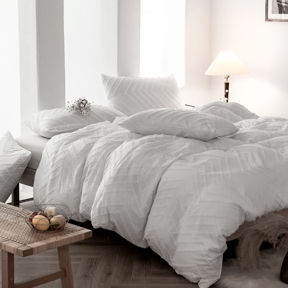 The 3-piece Arnaud Split King bedding includes: 1 duvet cover 118" x 97", 2 pillow shams 20'' x 36''. Made of 100% Jacquard Microfiber. The ties inside to help keep the duvet in place.Read More