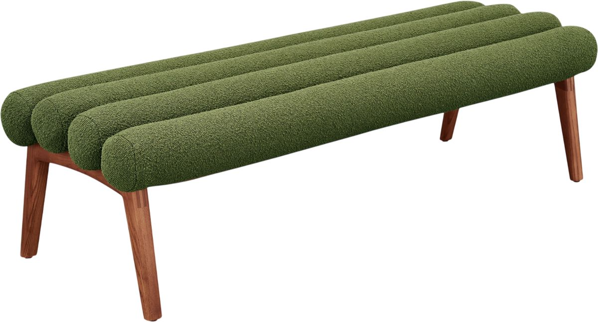 Comprised of a series of 5" diameter tubular forms, the bench's rounded ends provide a point of difference to more common plush channel detailing, while a textured boucle performance fabric finishes off the piece.