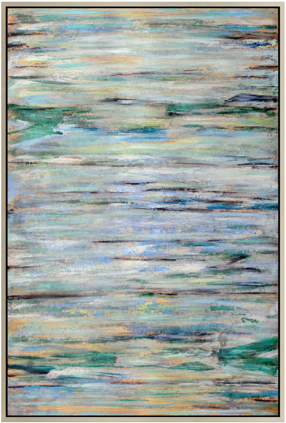At Moe’s, we firmly believe that the home provides an environment of comfort and positivity. This belief is exemplified in the detail and care we give to our products. We strive to keep our stores warm and inviting; welcoming customers to come and nourish their desire for home décor. Looks like the top of a serene pool. Earthy greens and faded blues. Acrylic paint. Comes with frame.
