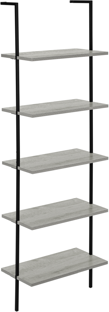 Five tier ample shelving made from engineered wood in a grey wood look finish and provide the perfect place for books, plants, bar essentials, or anything else you want to display. Mount this tall and narrow space-saving bookshelf to the wall in your home office, living room, or bedroom.