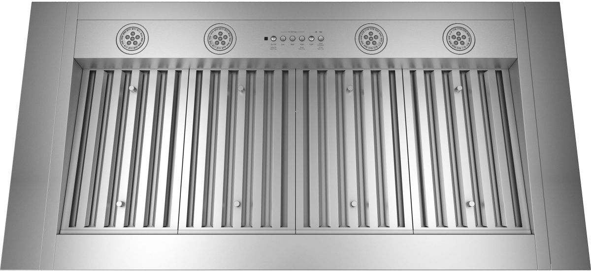 The baffle filters in this range hood trap more grease and require less frequent cleaning than standard filters