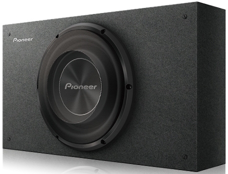 Pioneer 10" Black Shallow-Mount Pre-Loaded Enclosure Subwoofer features carpeted enclosure with embroidered logo and fully covered steel mesh grille.Read More