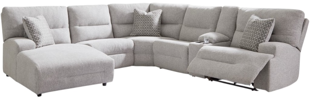 Includes 6 Modular Pieces: Left-arm facing power reclining back chaise, power armless recliner, armless chair, console with storage, wedge and right-arm facing power recliner