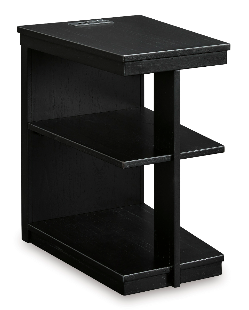 The wedge-shaped chairside table has 2 shelves and incorporates a 110V power supply with USB-A / USB-C charging ports conveniently located in the top
